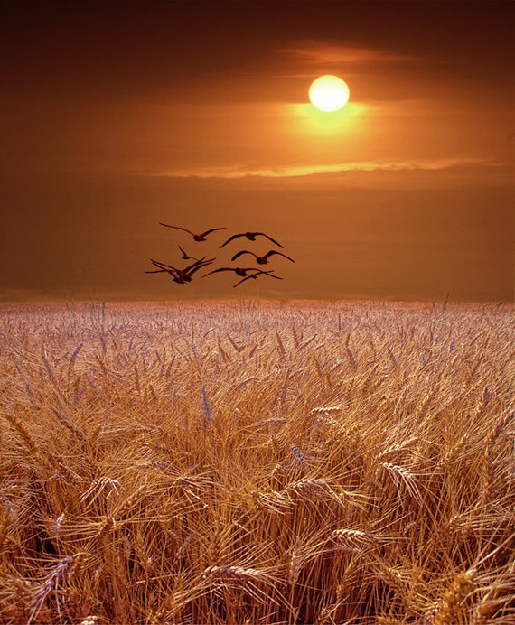 Gabbiani Che Volano Su Un Campo Di Grano Dorato Al Tramonto Etsy
