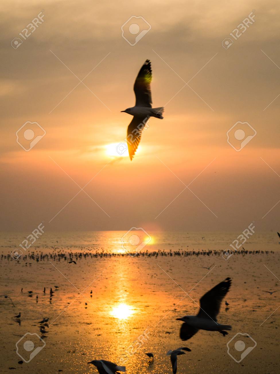 Immagini Stock Priorita Bassa Della Natura Dell Uccello Dei Gabbiani Al Tempo Di Tramonto E Del Mare Image 98146540