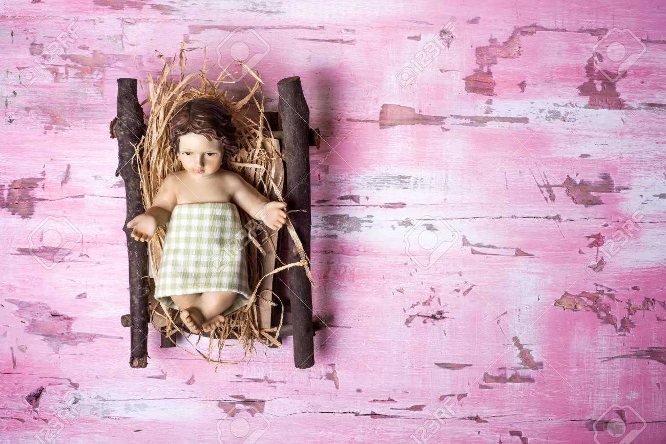 Immagini Stock Sfondo Gesu Bambino Di Natale Carina Statuetta Di Gesu Bambino Nella Sua Culla Su Fondo Rustico In Legno Di Colore Rosa Con Uno Spazio Vuoto Image 65332050