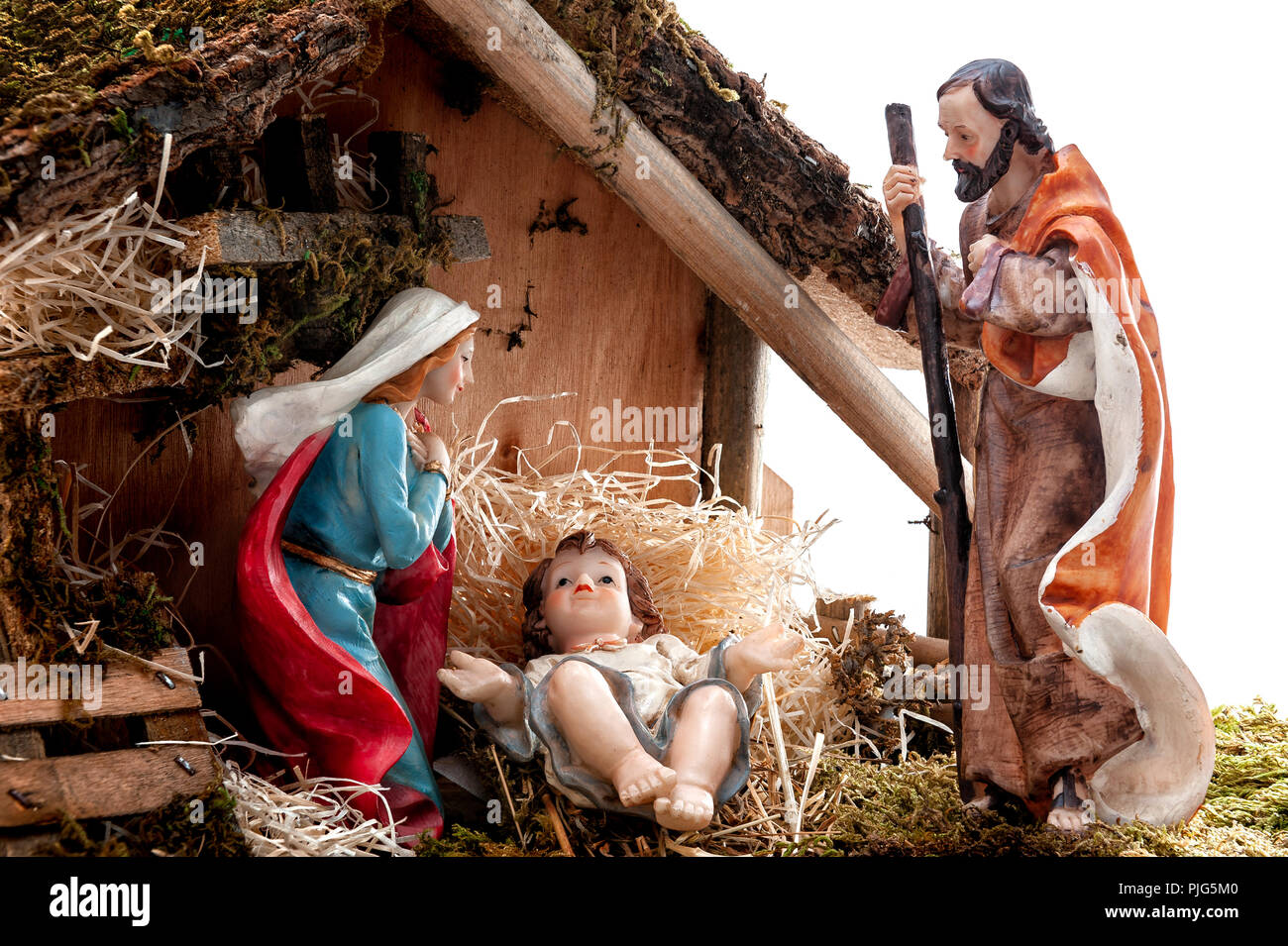 Presepe Capanna Con Gesu Bambino Nella Mangiatoia Con Maria E Giuseppe Isolato Su Sfondo Bianco Foto Stock Alamy