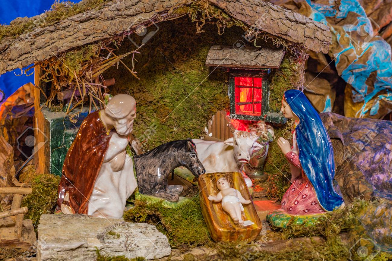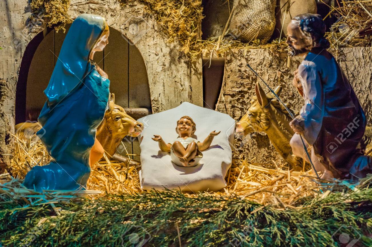 Immagini Stock Presepe Di Natale Di Gesu Bambino Nella Mangiatoia Con San Giuseppe La Beata Vergine Maria Il Bue E L Asino Image 68529907