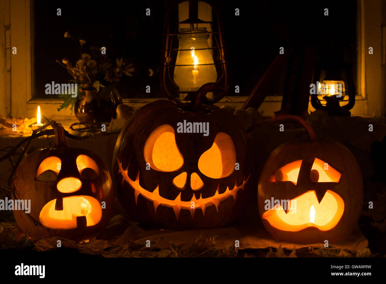 Composizione Della Foto Da Tre Zucche Di Halloween Il Pianto Jack E Spaventati Zucche Contro Una Vecchia Finestra Foglie Secche Foto Stock Alamy