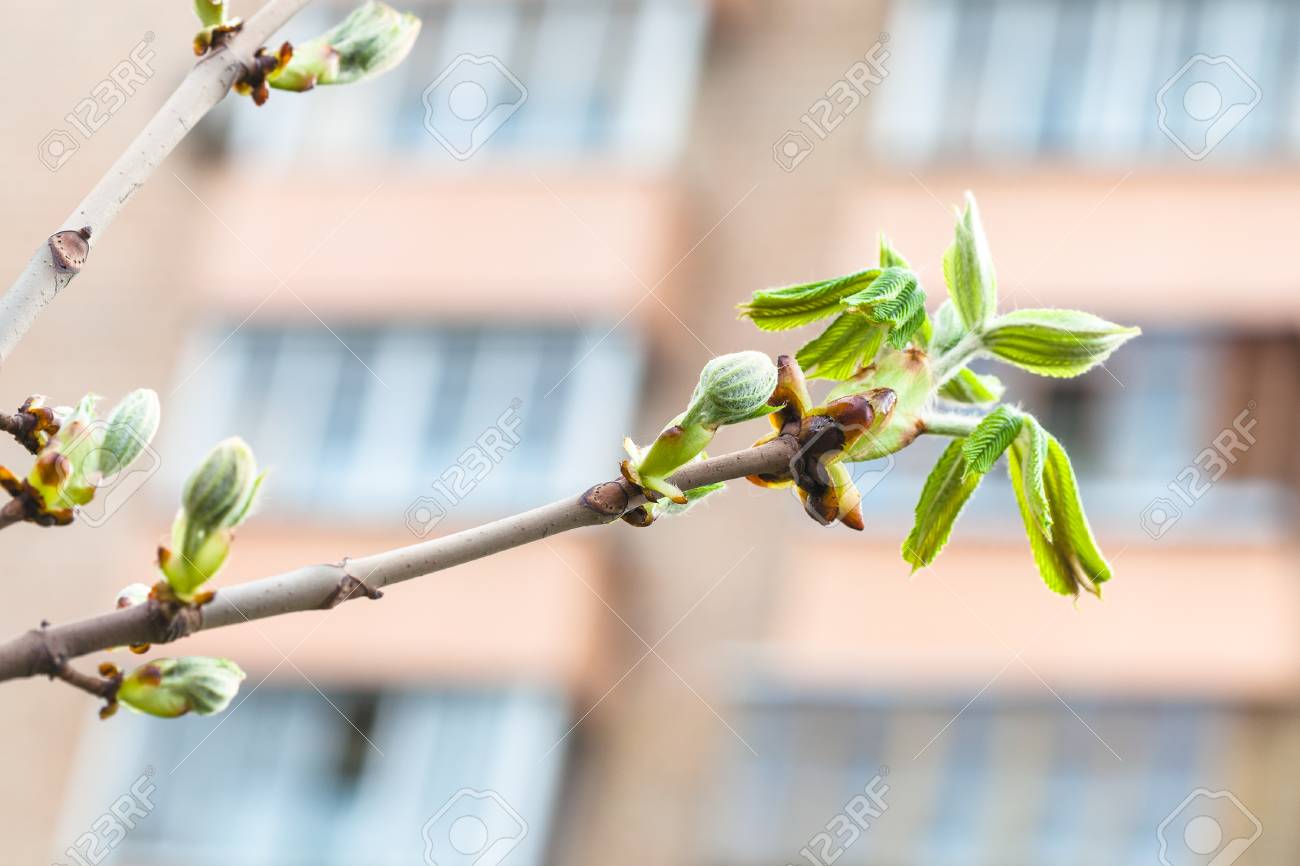 Immagini Stock Ramoscello Di Ippocastano Aesculus Hippocastanum Con Giovani Foglie Verdi In Citta Nel Giorno Di Primavera Image 78258918