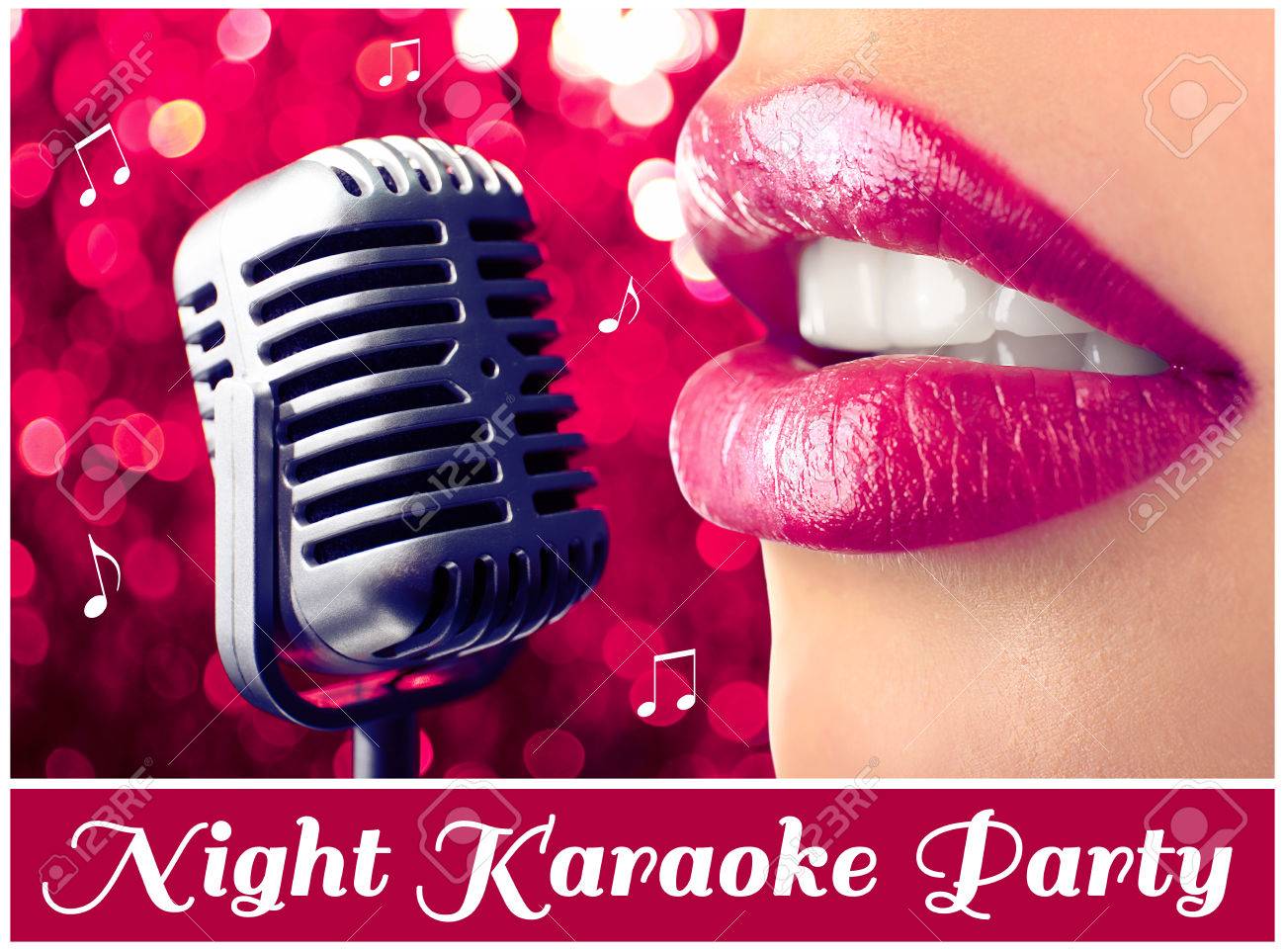 Immagini Stock Donna E Microfono Retro Sulle Luci Notturne Sfondo Concetto Partito Di Karaoke Image 35777626