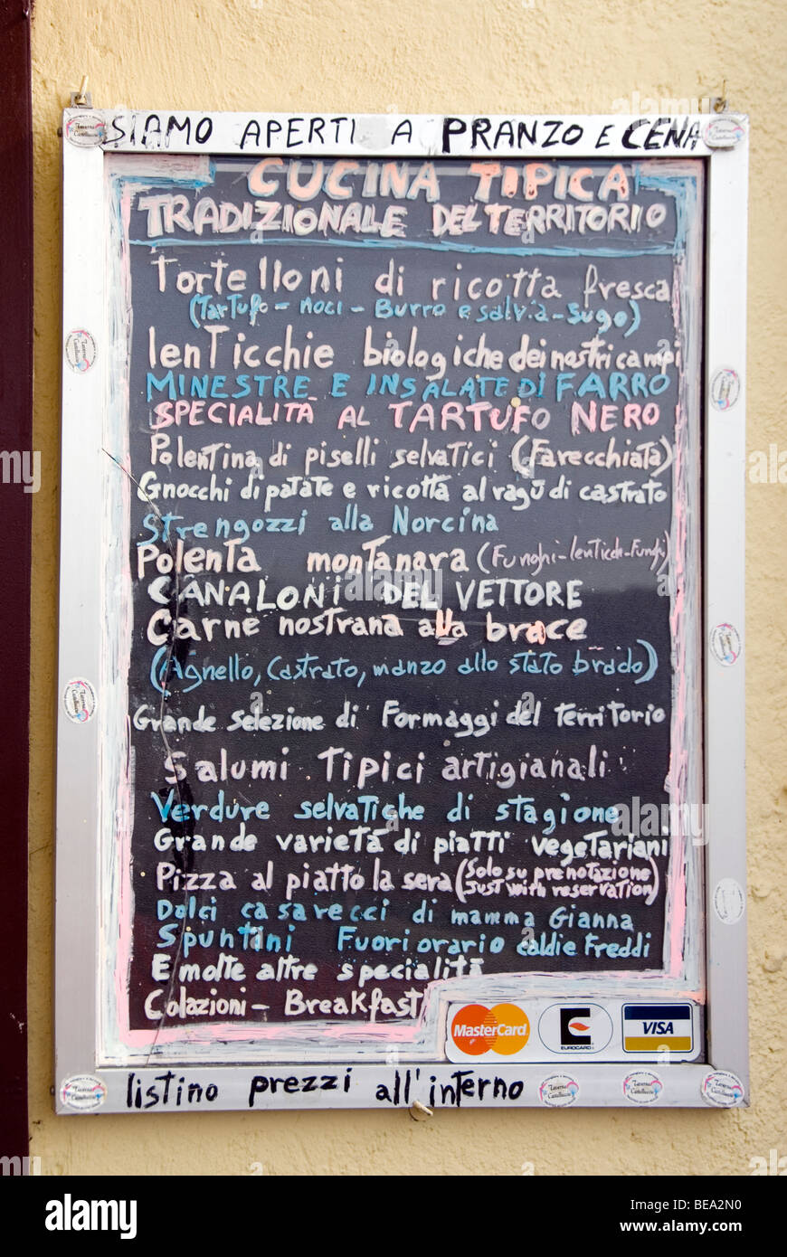 Rustico Scheda Menu Con Piatti Tipici Locali Al Di Fuori Di Un Ristorante A Castelluccio In Umbria Foto Stock Alamy