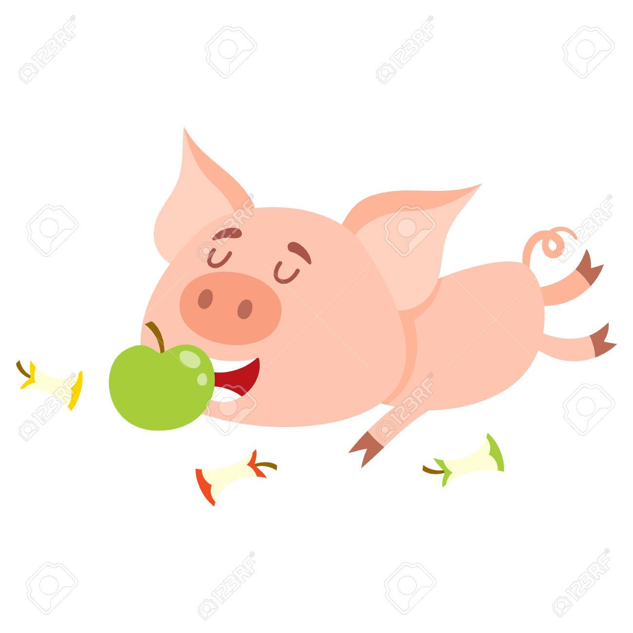 Vettoriale Piccolo Maiale Divertente Che Si Trova E Che Mangia Mela Con Tre Piu Ceppi Intorno Illustrazione Di Vettore Del Fumetto Isolata Su Fondo Bianco Maiale Sveglio Che Mangia Mela Concetto