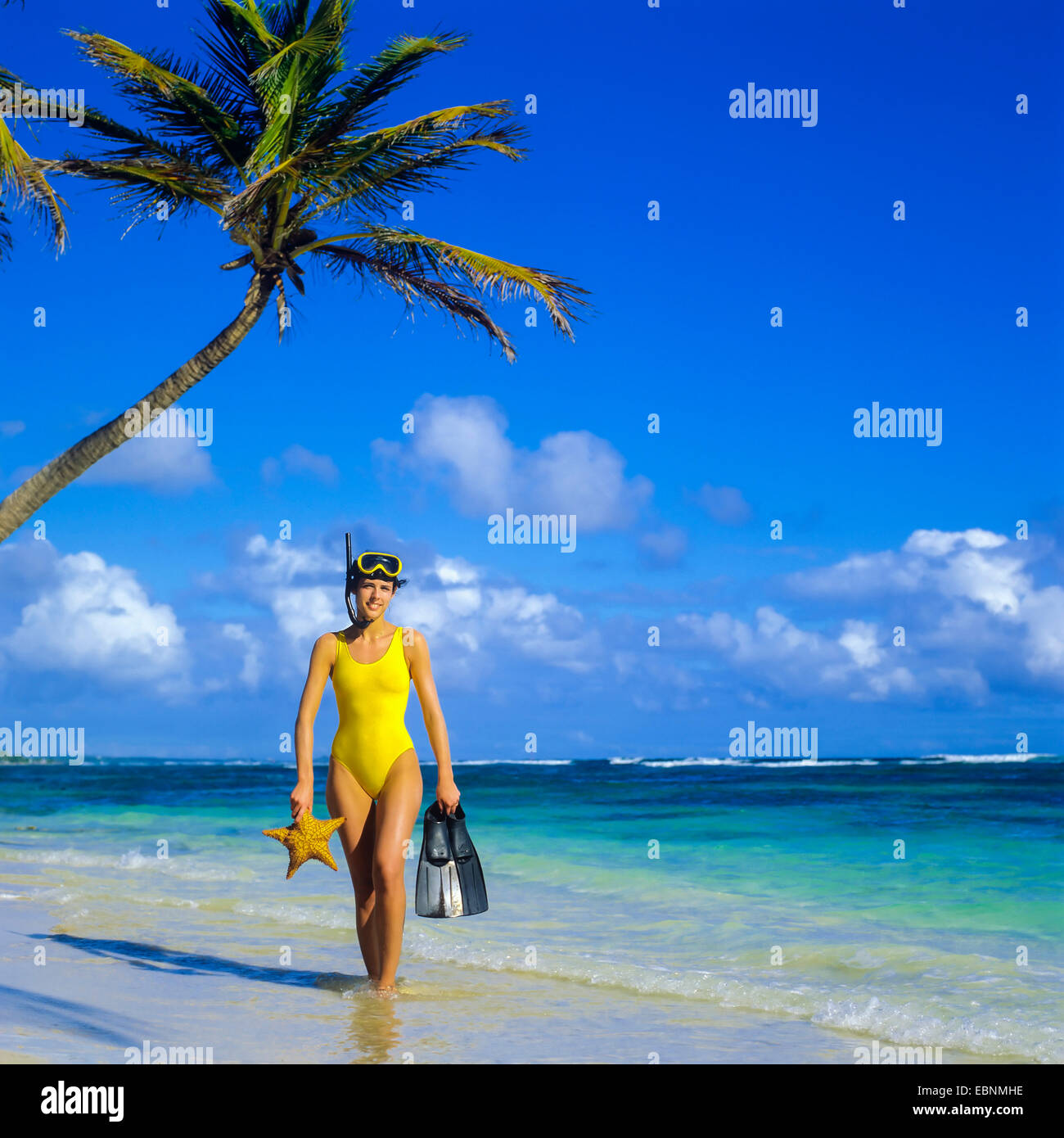 Giovane Donna Con Attrezzatura Snorkeling E La Stella Di Mare Sulla Spiaggia Caraibica Guadalupa French West Indies Foto Stock Alamy