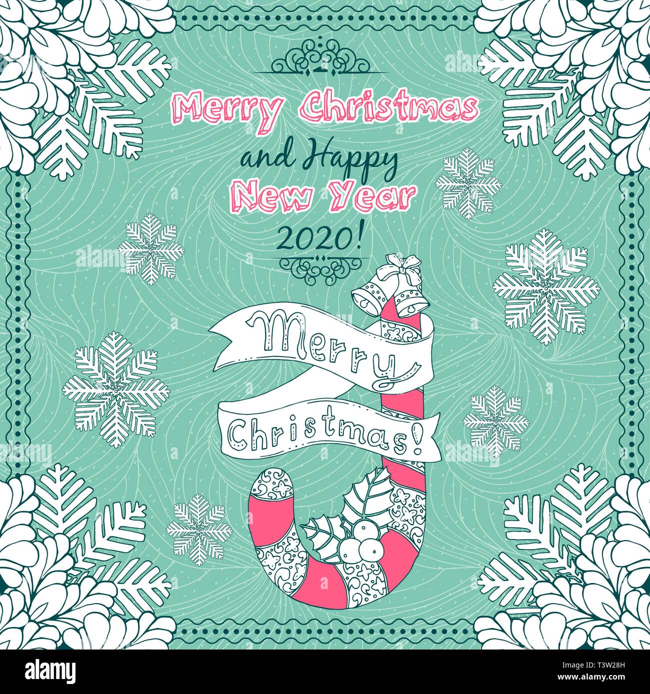 Hand Drawn Doodles With Merry Christmas And Happy New Year 2020 Lettering Vector Gift Card Green Color With Snowflakes And Candy Cane Ribbon Poster Stock Vector Image Art Alamy