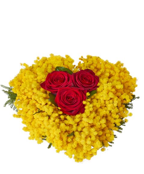 Cuore Di Mimose Con Rose Bianche E Rose Rosse Al Centro