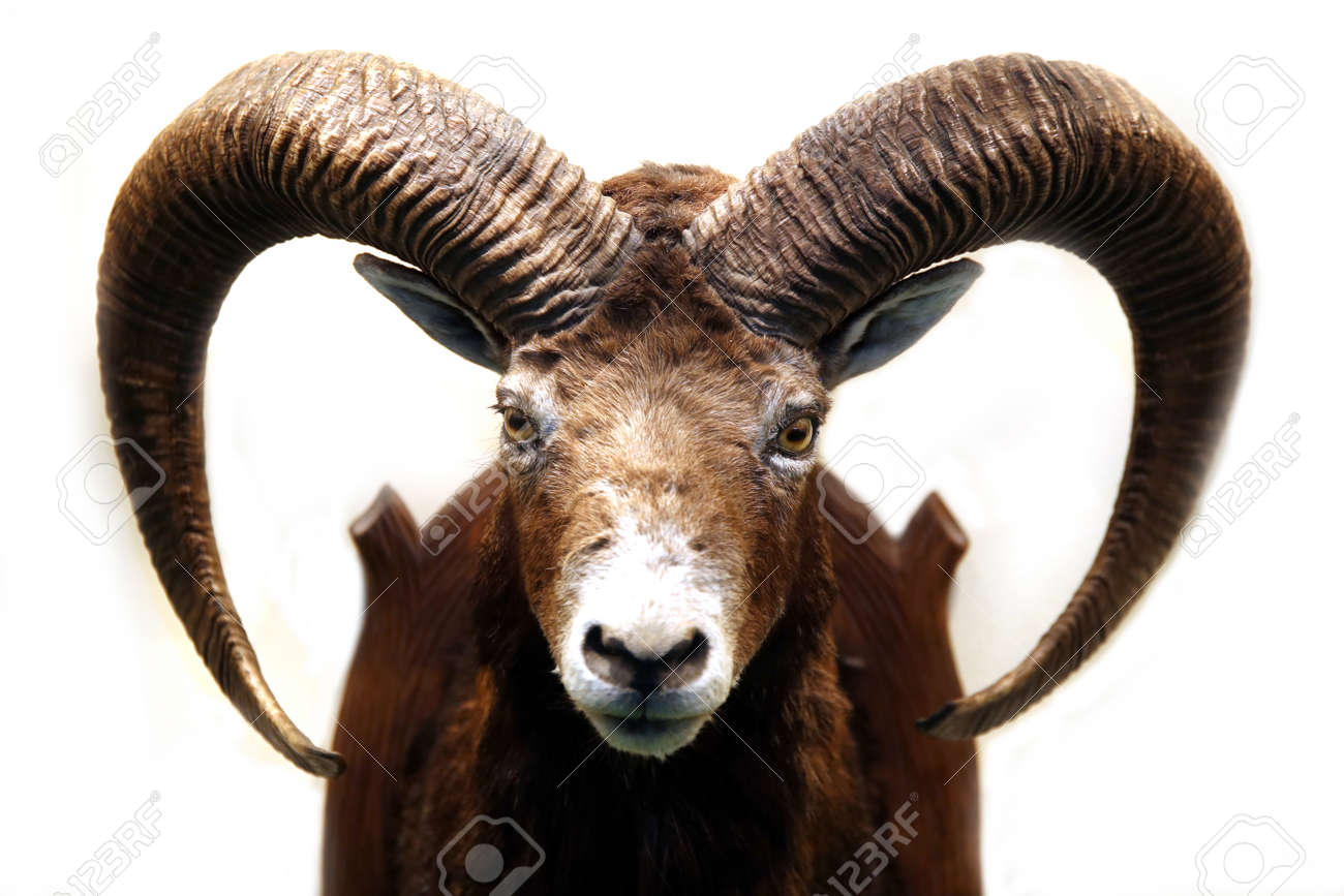 Immagini Stock Primo Piano Di Mufloni Maschio Farcito Con Grandi Corna Curve Su Sfondo Bianco Profondita Di Campo Image 55169462