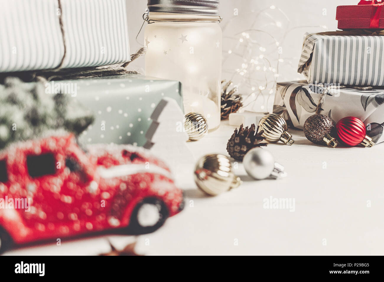 Moderne Decorazioni Natalizie E Auto Giocattolo Con Albero Presenta Coni Anice Bianco Su Sfondo Di Legno Buon Natale Concetto Saluti Stagionali Felice Foto Stock Alamy
