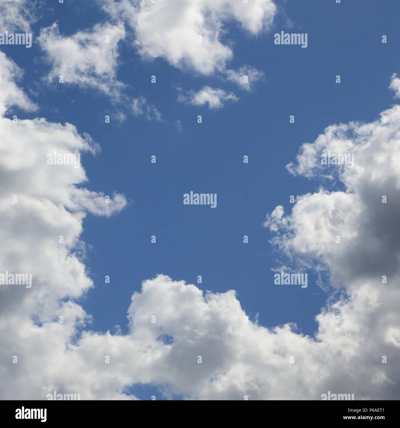 Il Cielo Blu Con Un Sacco Di Nuvole Bianche Di Diverse Dimensioni Formando Una Cornice Attorno Alla Zona Senza Nuvole Foto Stock Alamy