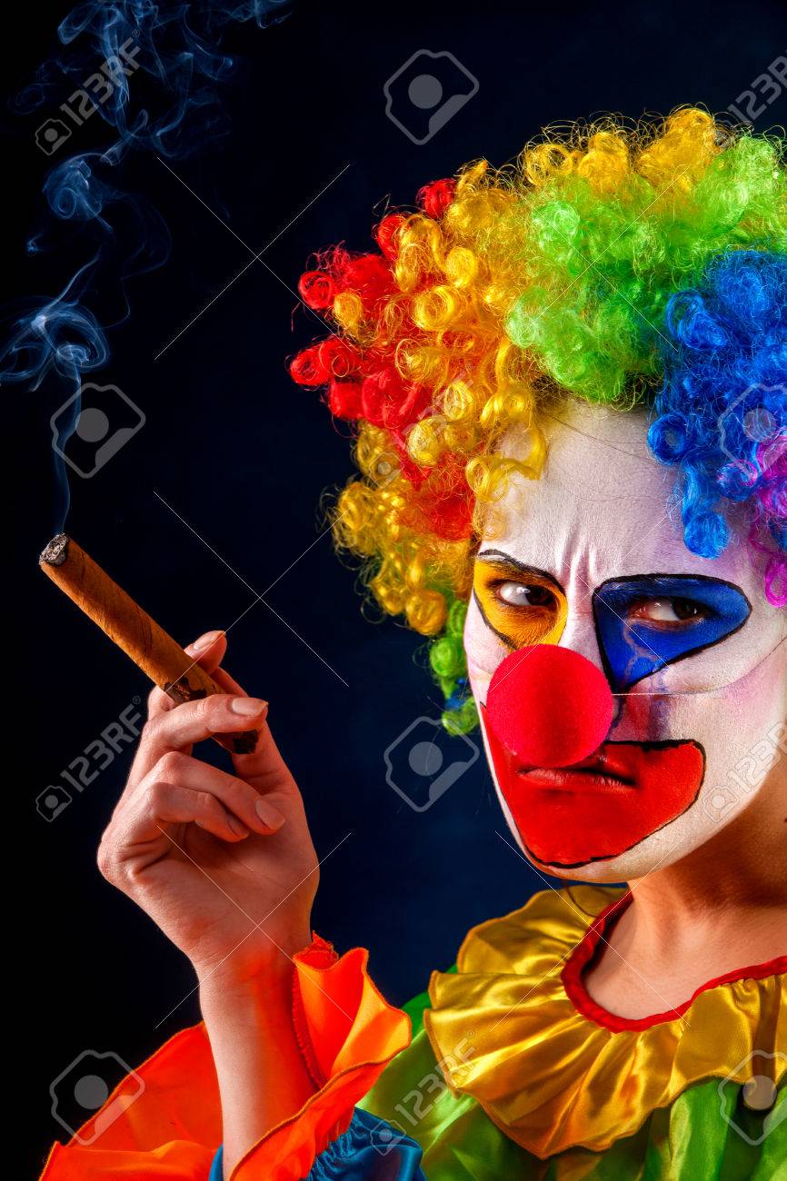 Immagini Stock Pagliaccio Pazzo Su Priorita Bassa Nera La Donna E Fumo Di Sigaretta Ritratto Di Femmina Triste Triste Con Guardia Arrabbiata Dopo Le Prestazioni Delusione Nel Suo Concetto Di Professione