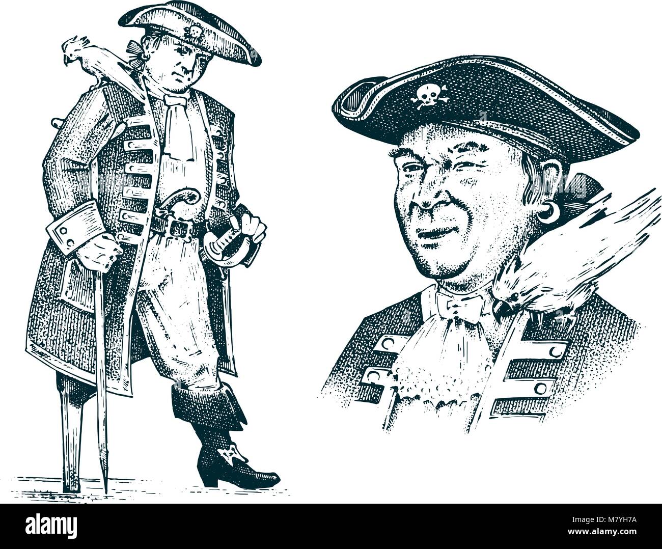 Ritratto Di Pirati Capitano Uomo A Bordo Di Una Nave Che Viaggia Attraverso I Mari E Gli Oceani Avventura Marina Del Marinaio Gancio Incisi Sketch Disegnati A Mano In Stile Vintage Design