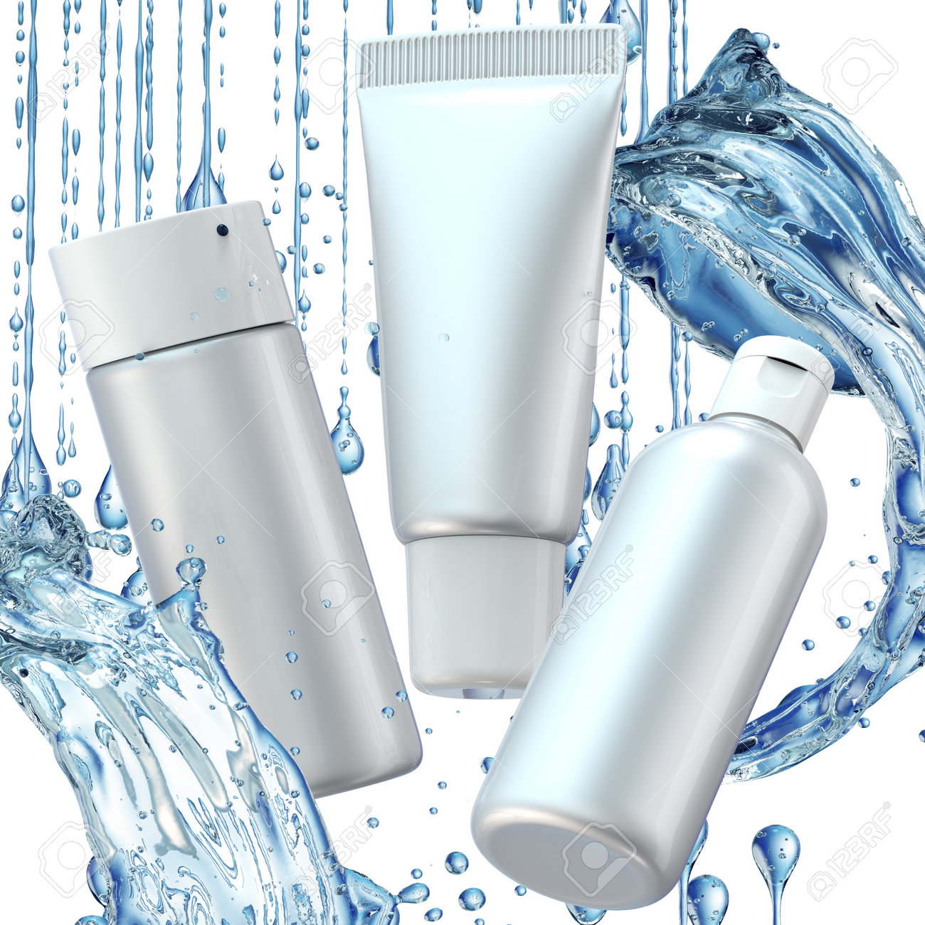 Immagini Stock Disegno Di Prodotti Cosmetici Di Pubblicita Nella Spruzzata D Acqua Su Sfondo Blu Illustrazione 3d Image 85491558