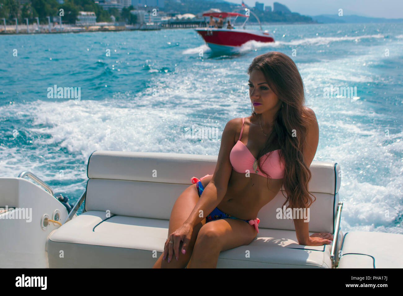 Giovane Bella Bruna Ragazza Seduta Su Yacht Di Lusso In Un Costume Da Bagno Le Ragazze