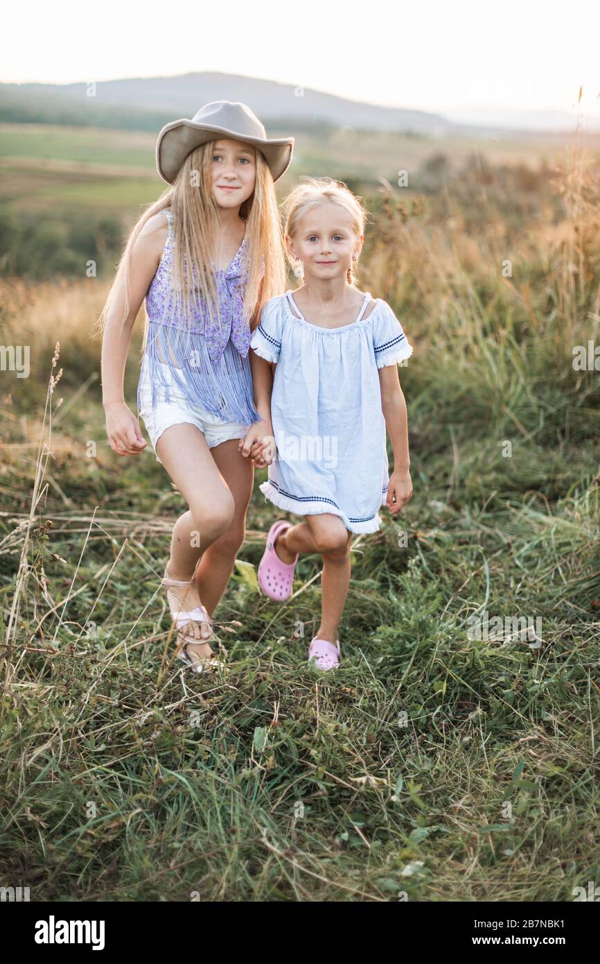 Ritratto Di Due Belle Ragazze Che Si Divertono All Aperto Camminando In Campo Estivo Belle Ragazze Sorridenti Bambini Con Capelli Biondi In Campo In Estate Foto Stock Alamy