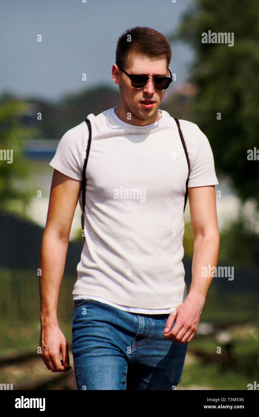 Giovane Ragazzo Bello Camminare Lungo La Vecchia Ferrovia Godendo I Suoi Dintorni Sulla Giornata Di Sole Uomo Di Viaggiatori Su Ferrovia Seguendo Il Vecchio Percorso Ferroviario Foto Stock Alamy