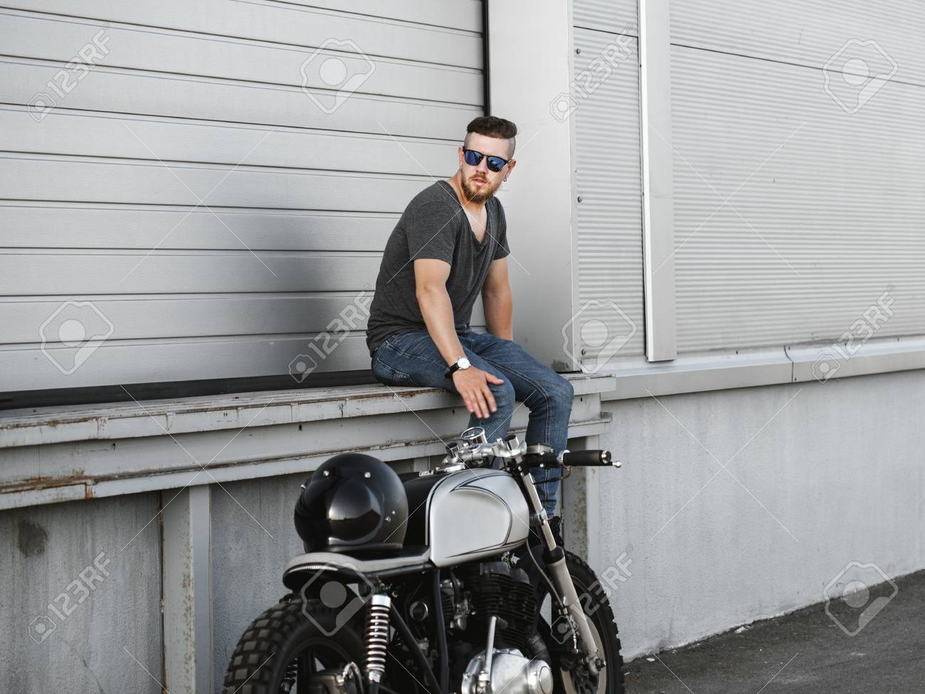 Immagini Stock Ragazzo Bello Pilota Con Barba E Baffi Con Moto Da Corsa In Stile Classico Cafe Al Giorno Bicicletta Custom Made In Garage D Epoca Stile Di Vita Urbano Brutale Image