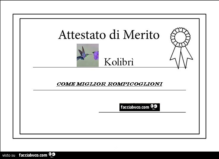 Attestato Di Merito A Kolibri Come Miglior Rompicoglioni Di Facciabuco Facciabuco Com