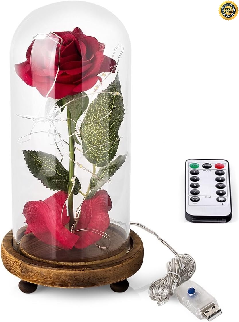 Kit Di Rose La Bella E La Bestia Rosa Rossa Di Seta E Luce A Led Con Petali Caduti In Cupola Di Vetro Su Base In Legno Anniversario Di Matrimonio Festa Della