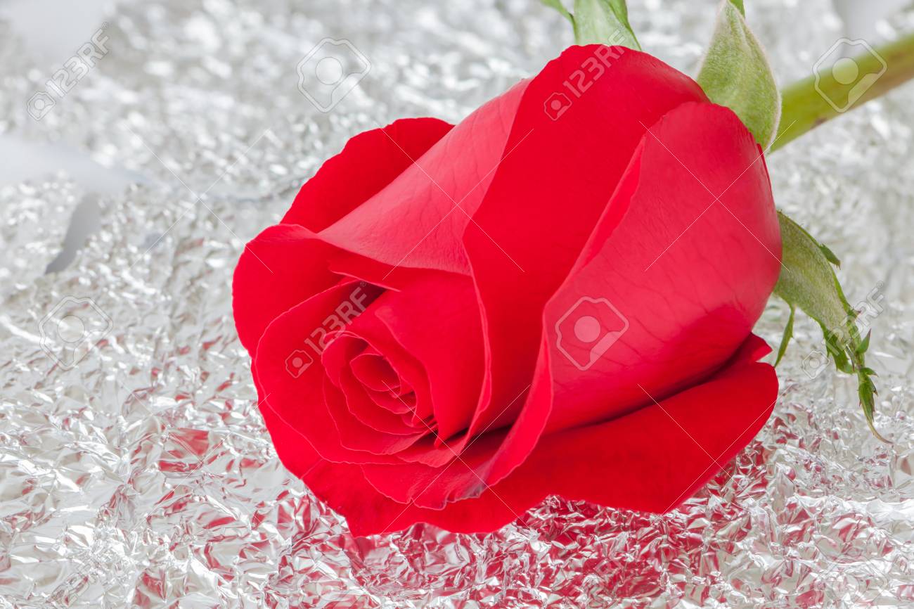 Immagini Stock Giorno Del Biglietto Di S Valentino Felice Primo Piano Una Bella Rosa Rossa Singola E In Fiore Sulla Lamina D Argento Lucida Image 71270587