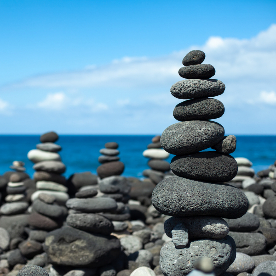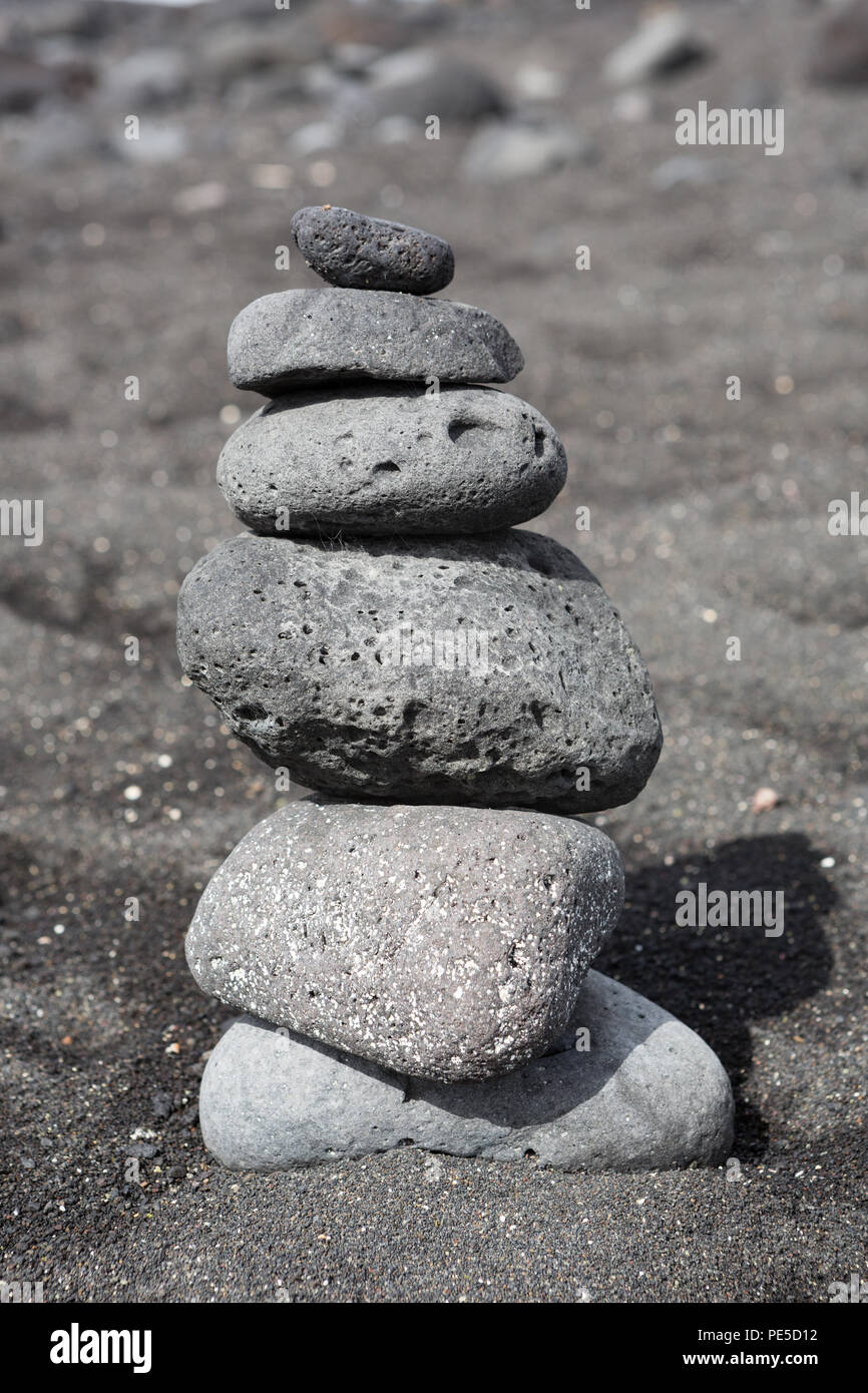 Impilati Equilibrata Di Sassi O Ciottoli Su Una Spiaggia Di Sabbia Nera Foto Stock Alamy