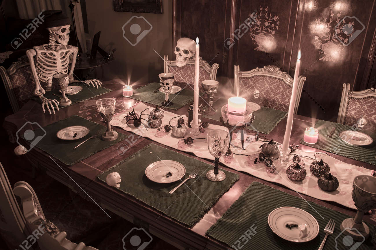 Immagini Stock La Famiglia Di Scheletri Si E Riunita Per Una Cena Di Halloween Che Celebra La Festa In Un Tavolo Da Pranzo Formale Image 68960872
