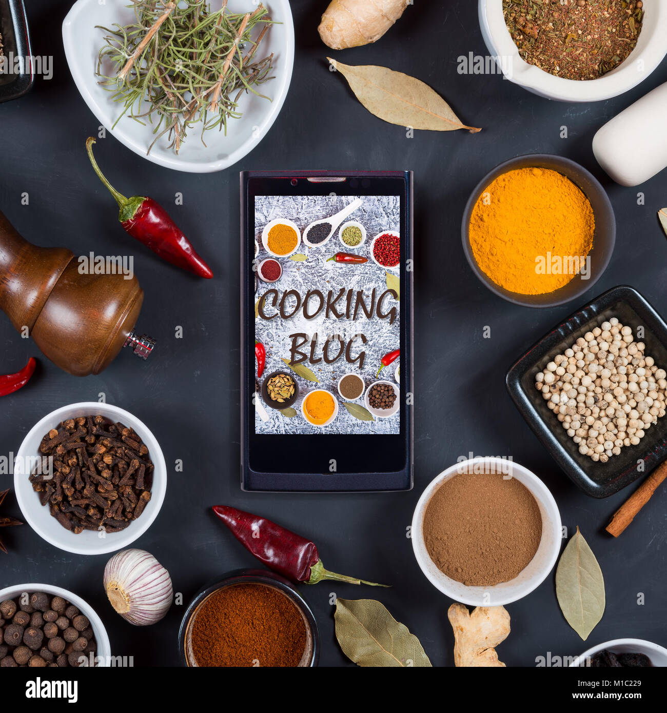 Blog Di Cucina Concetto Spezie Indiane Erbe E Smartphone Su Sfondo Nero Foto Stock Alamy