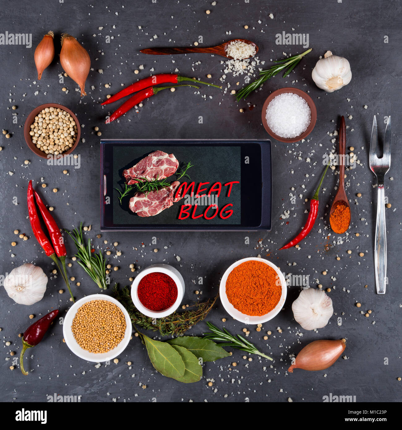 Blog Di Carne Concetto Smartphone Con Spezie E Verdure E Forcella Per La Carne Su Uno Sfondo Scuro Foto Stock Alamy