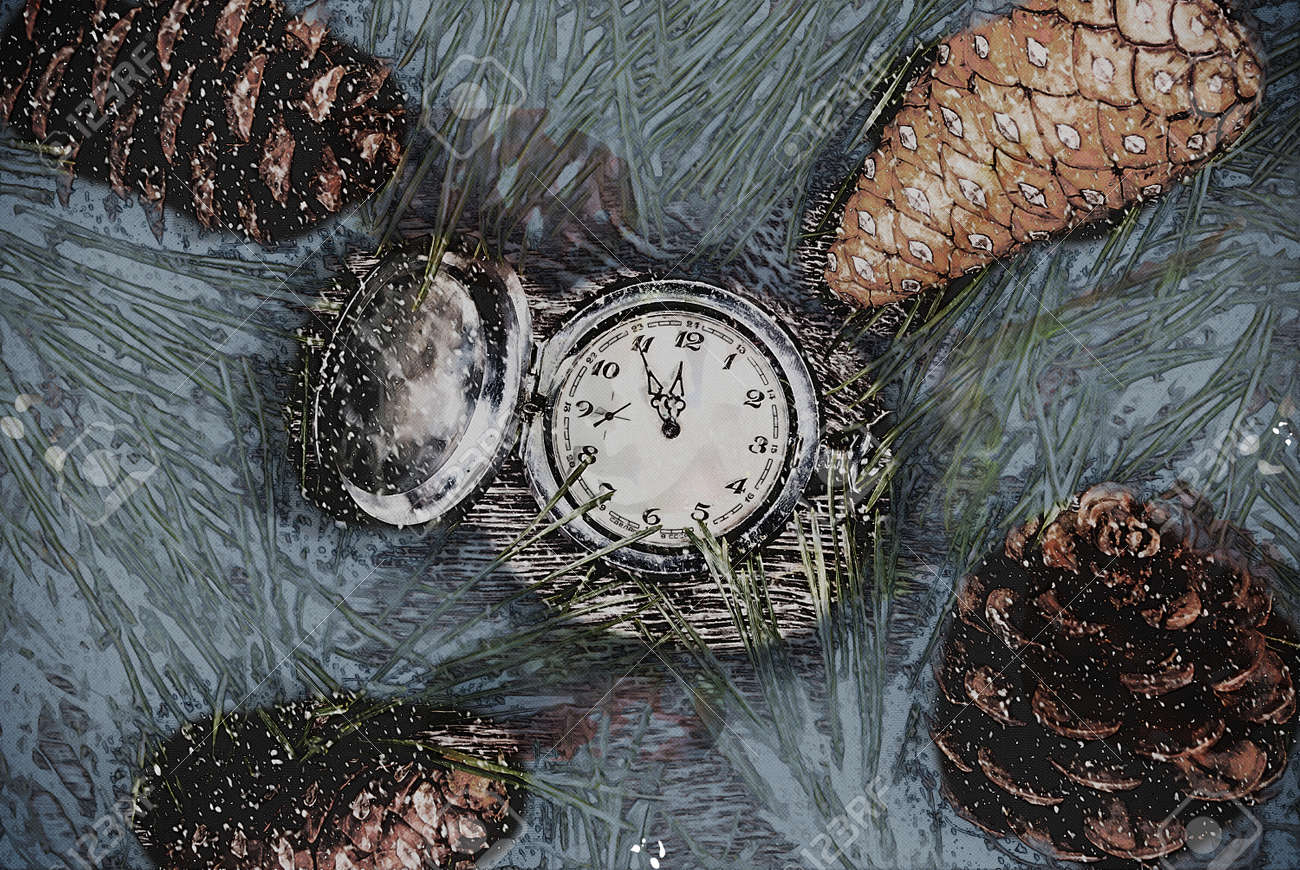 Immagini Stock Sfondo Di Natale Con Orologio Tra Abete E Coni Immagine Per Banner Pubblicita E Blog Illustrazione Di Vacanza Trama Di Stile Di Pittura Moderna Image 66316333
