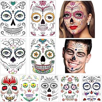 Day Of The Dead Skeleton Face Tattoo 9 Fogli Teschio Di Zucchero Glitter Rose Rosse Day Of The Dead Sugar Skull Tatuaggio Temporaneo Viso Amazon It Bellezza