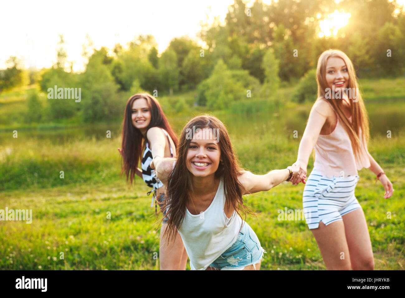 Tre Ragazze Bellissime Passeggiate E Ridere Sul Tramonto Nel Parco Il Concetto Di Amicizia Foto Stock Alamy
