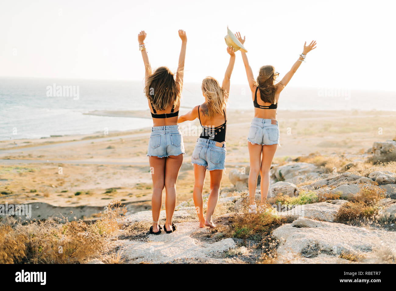 Vista Posteriore Indietro Di Tre Ragazze Holding Hands Up Indossando Un Cappello E Jeans Godendo Della Vista Sulla Spiaggia Durante Il Tramonto Foto Stock Alamy