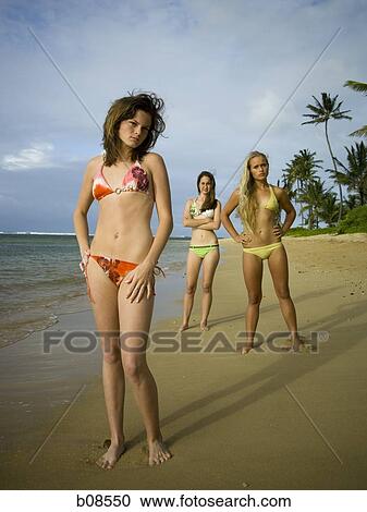 Ritratto Di Tre Ragazze Adolescenti Stare Piedi Spiaggia Archivio Immagini B08550 Fotosearch