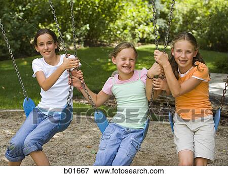 Ritratto Di Tre Ragazze Seduta Su Altalene Archivio Fotografico B01667 Fotosearch