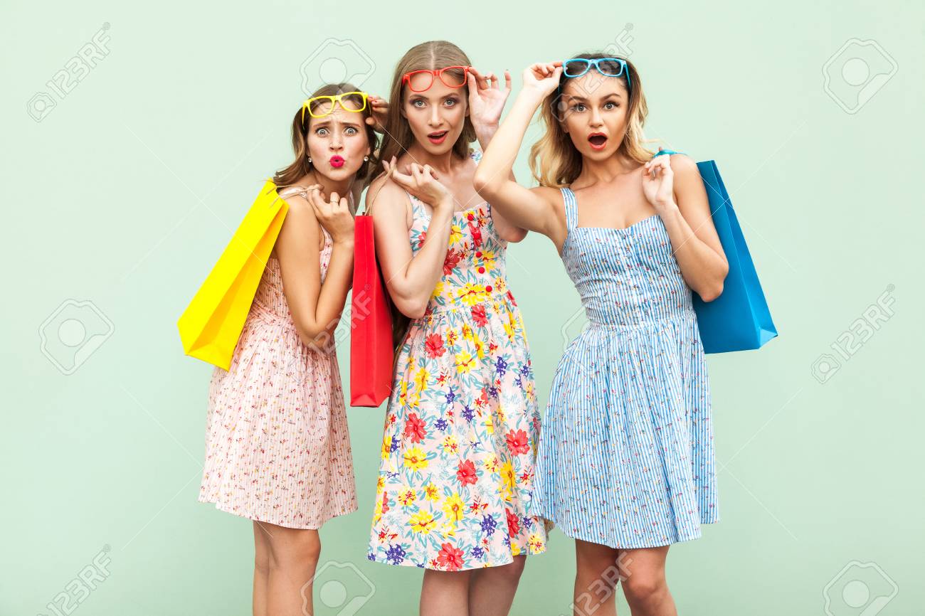Immagini Stock Tre Ragazze Di Meraviglia Con Pacchetti E Vestiti Nuovi In Sconvolto Dal Venerdi Nero Guardando La Fotocamera E Stupito Studio Girato Sfondo Verde Image 86270663