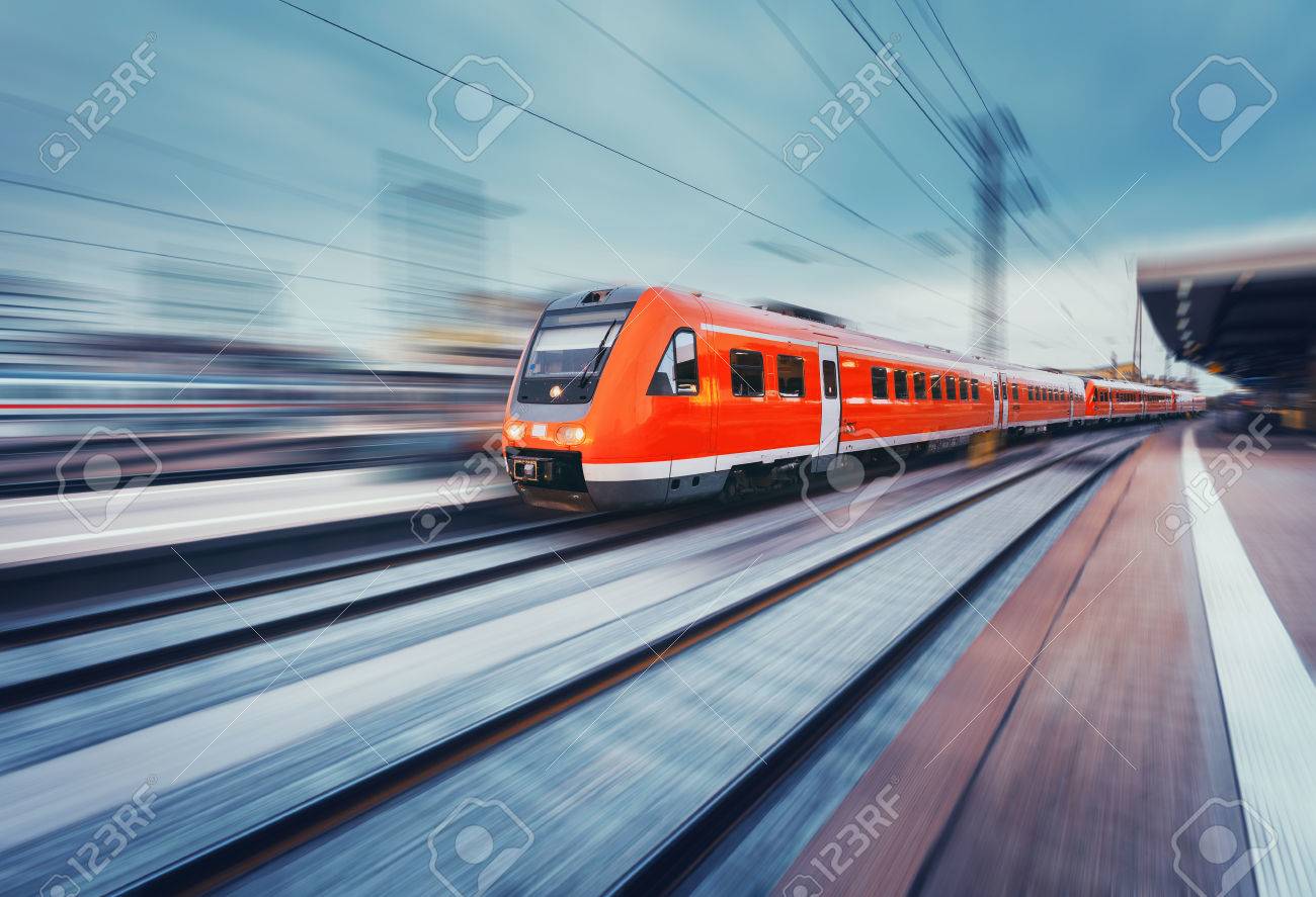 Immagini Stock Moderno Treno Di Passeggeri Rosso Ad Alta Velocita Veloce In Movimento Alla Piattaforma Ferroviaria Stazione Ferroviaria Ferrovia Con Effetto Di Sfocatura Di Movimento Image 65921542