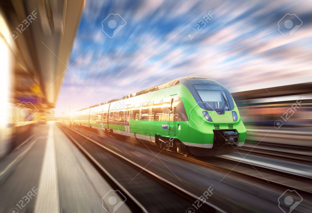 Immagini Stock Treno Ad Alta Velocita In Movimento Alla Stazione Ferroviaria Al Tramonto In Europa Bello Treno Moderno Verde Sulla Piattaforma Ferroviaria Con Effetto Di Sfocatura Di Movimento Scena Industriale Con