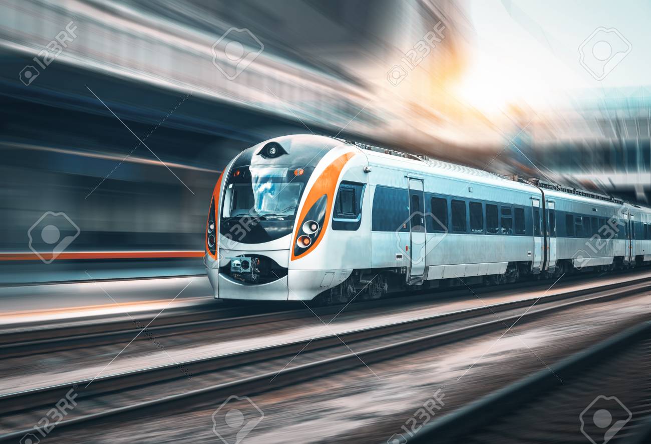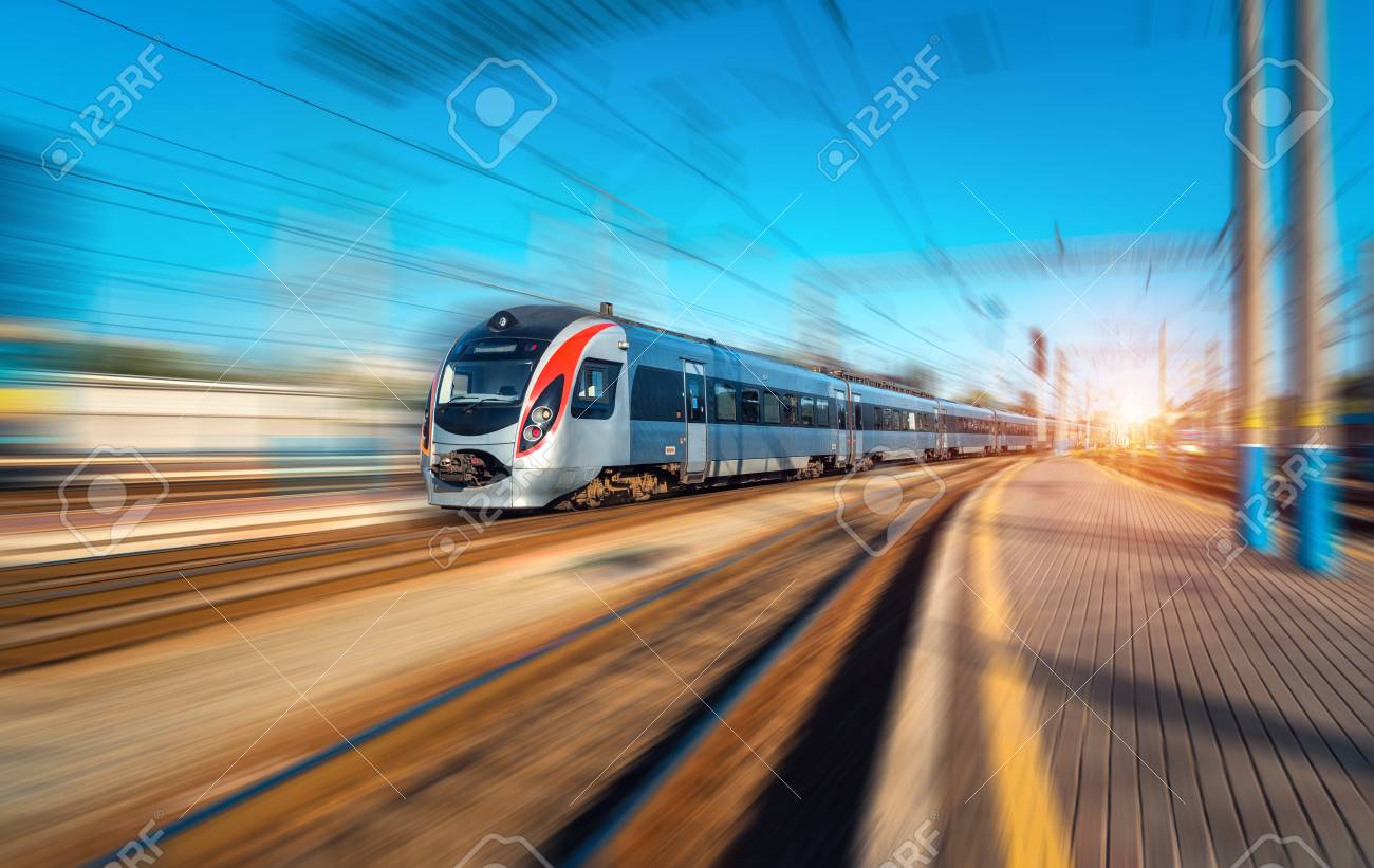 Immagini Stock Treno Ad Alta Velocita In Movimento Alla Stazione Ferroviaria Al Tramonto In Europa Treno Intercity Moderno Sulla Piattaforma Ferroviaria Con Effetto Di Sfocatura Del Movimento Paesaggio Industriale Con Treno