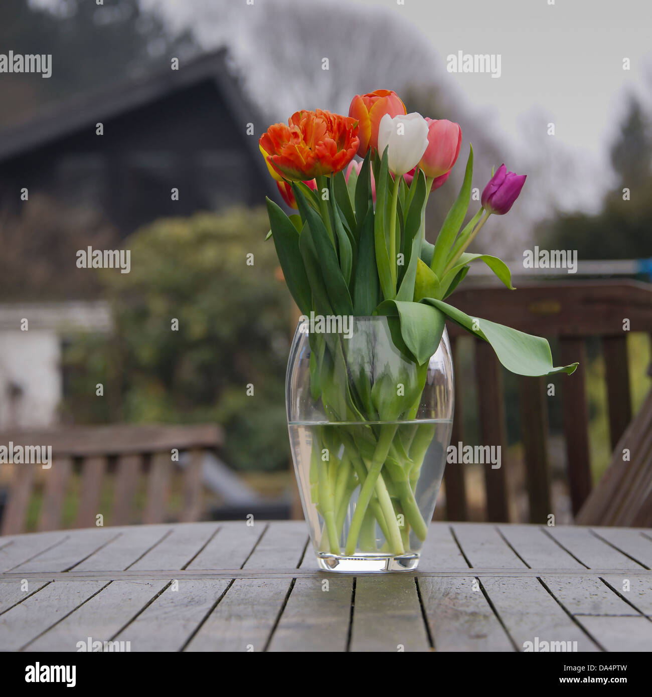 Un Mazzo Di Tulipani Colorati In Un Vaso Su Un Tavolo Foto Stock Alamy