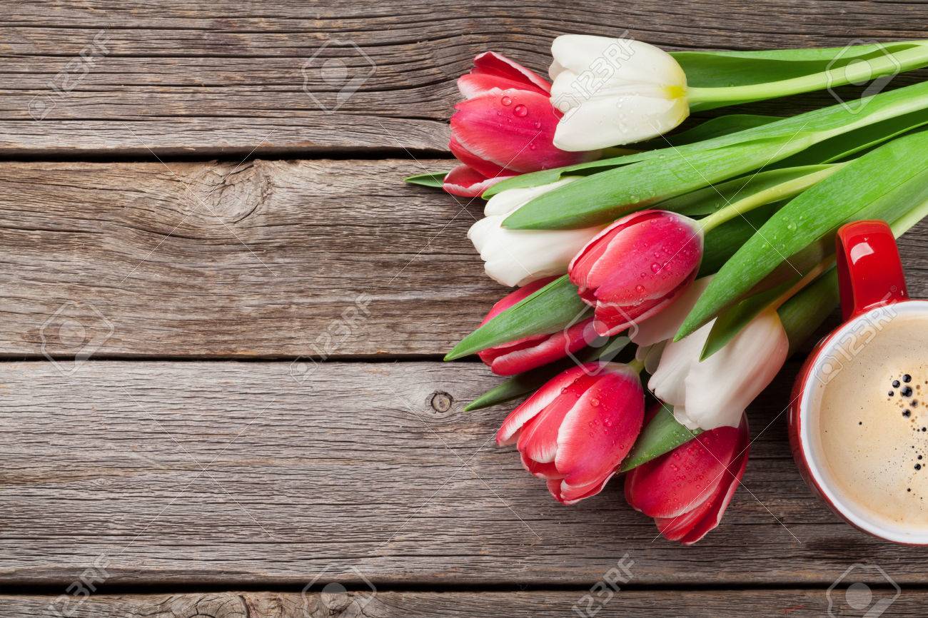 Immagini Stock Bouquet Di Tulipani Colorati E Tazza Di Caffe Su Sfondo Di Legno Rosso E Bianco Con Spazio Per Saluti Image 71670209