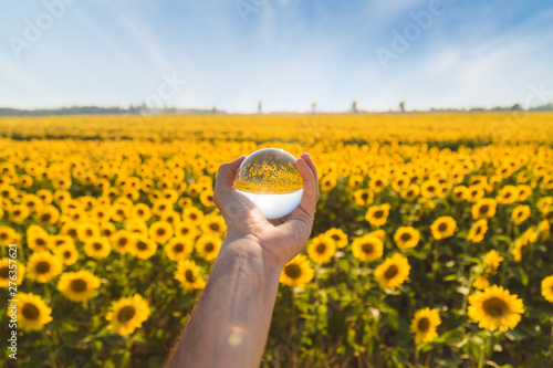 Immagini Stock L Uomo In Un Campo Di Girasoli L Uomo E In Piedi In Un Campo Di Girasole Con Uno Sfondo Blu Cielo Travaling E Il Concetto Di Natura Image 61312724