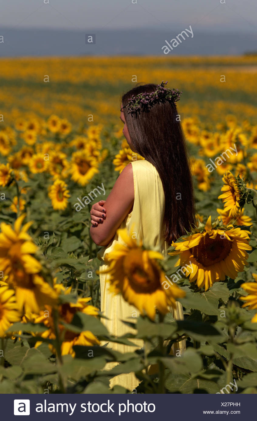 Giovane Donna In Un Campo Di Girasoli Francia Foto Stock Alamy