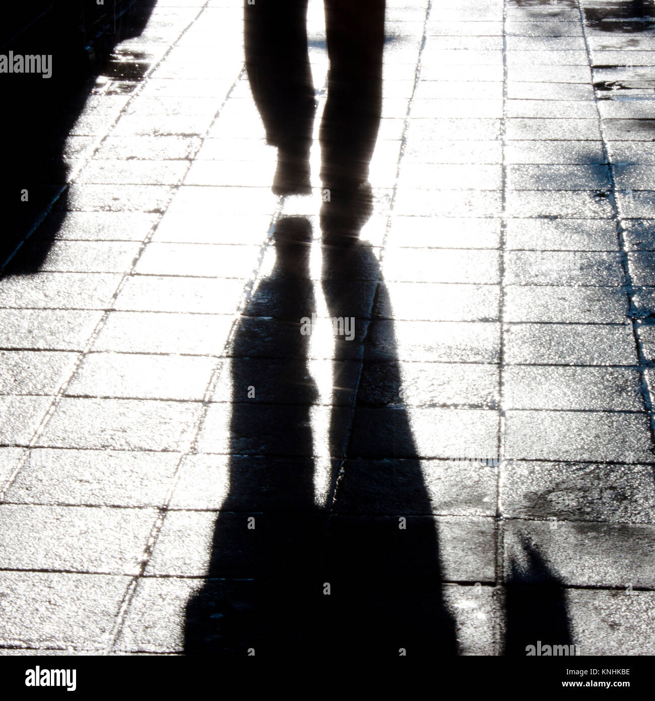 Silhouette Sfocati E Ombra Di Un Uomo Per Le Gambe Camminare Da Solo Su Bagnato Via Della Citta Con La Riflessione E La Sfocatura Dopo La Pioggia In Bianco E Nero Foto