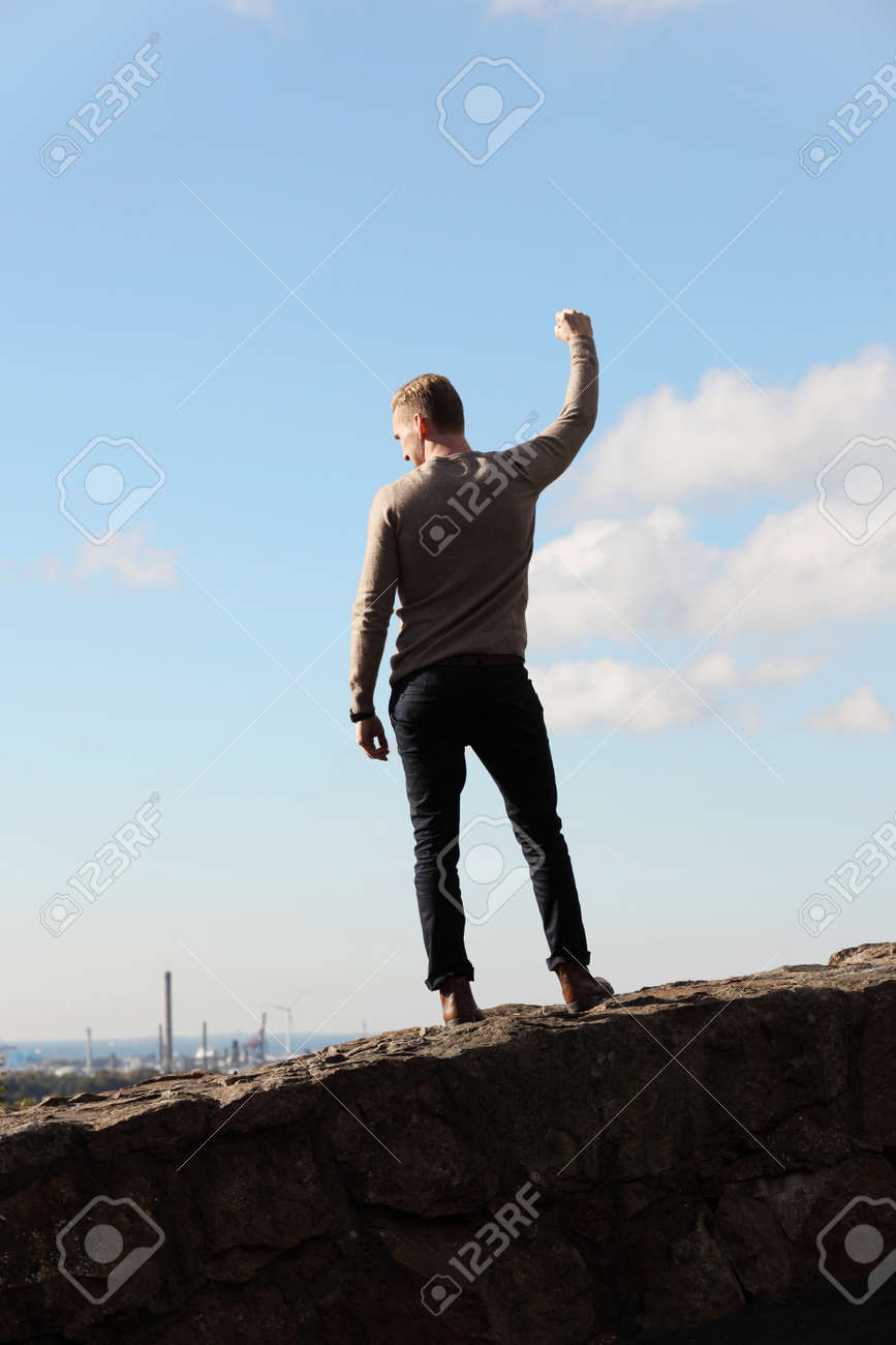 Immagini Stock Un Uomo Solo In Piedi Sulla Cima Di Un Muro Con Una Grande Vista Della Citta Di Fronte A Lui Una Giornata Di Sole Estivo Con Cielo Blu Con