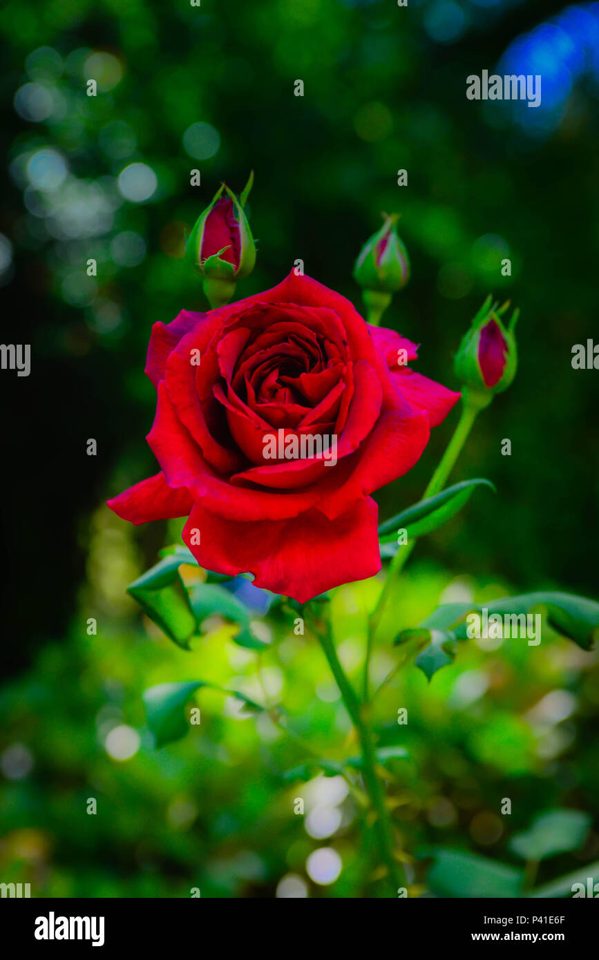 Un Primo Piano Di Una Rosa Rossa Fiore Con Tre Gemme Circa A Fiorire In Un Giardino Di Rose Con Una Messa A Fuoco Morbida Dello Sfondo Foto Stock Alamy