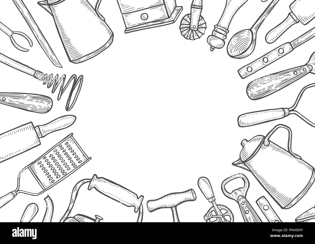 Sfondo Di Utensili Da Cucina Set Vettore Grande Collezione Disegnata A Mano Illustrazione Con Utensili Da Cucina Utensile E Cottura Stoviglie Sketch Retro Immagine E Vettoriale Alamy