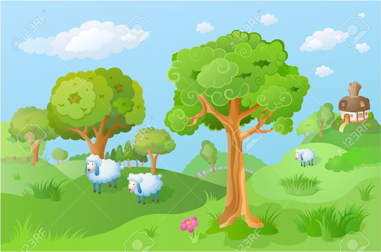 Vettoriale Lamb Nel Paesaggio Cartone Animato Casa Fata E Visto In Lontananza Divertenti Cartoni Animati E Il Vettore Di Scena Image 35266421
