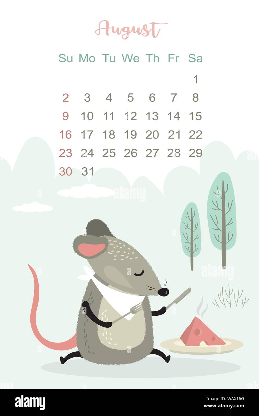 Il Mese Di Agosto 2020 Progettazione Del Modello Calendario 2020 Con Divertenti E Carino Rat Il Layout Verticale Felice Carattere Animale Topo Mangia Formaggio Illustrati Del Vettore Immagine E Vettoriale Alamy